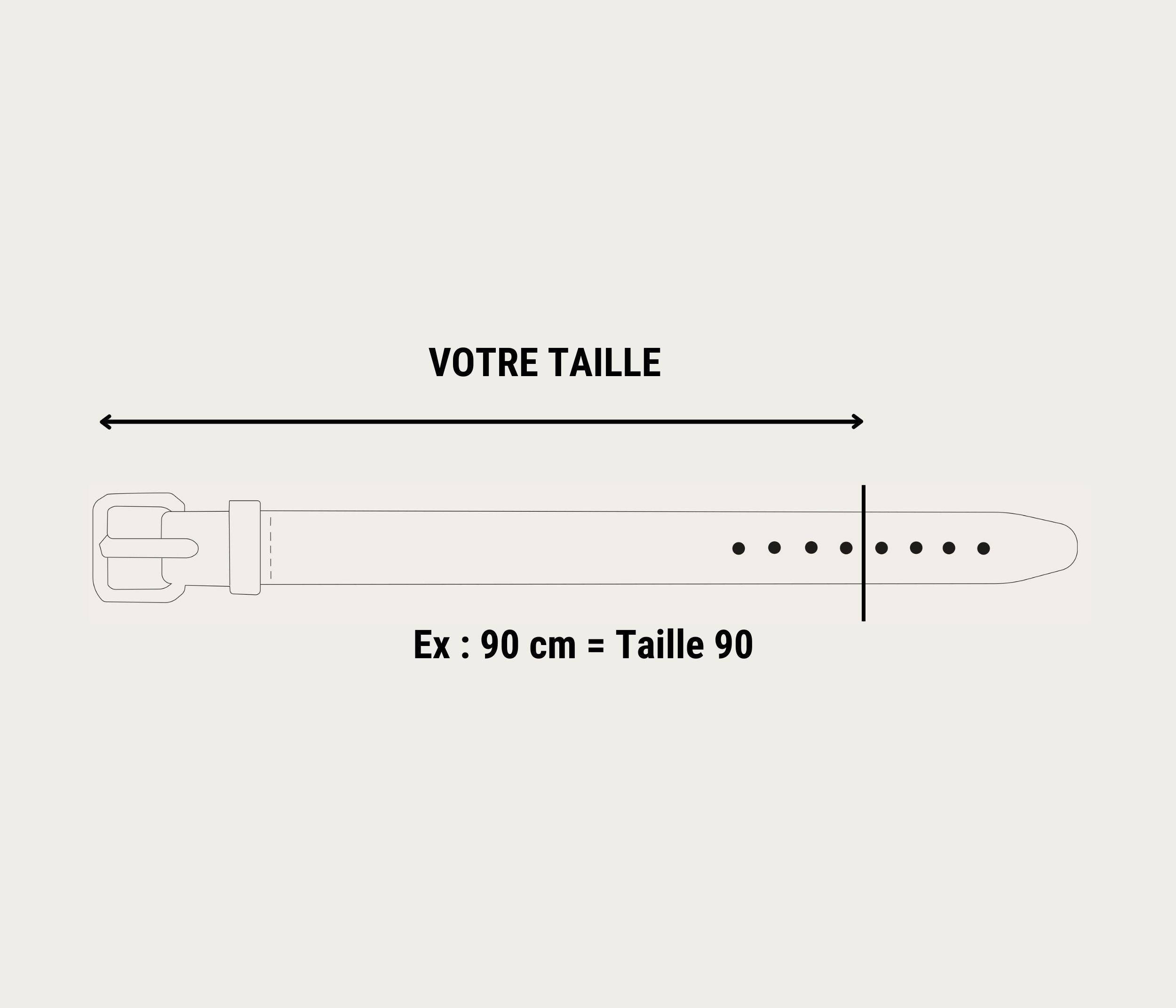 Nos ceintures sont mesurées du bout de la boucle au trou central. Assurez-vous de mesurer votre tour de taille et de choisir une ceinture avec une longueur suffisante pour atteindre le trou central tout en laissant un peu de marge pour un ajustement parfait.